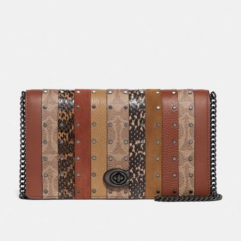 This gently-worn Callie design made its way to the Coach Repair Workshop and—thanks to the technical skill of their talented craftspeople—she’s got a new lease on life. Crafted in a convertible clutch silhouette with a chain strap and featuring a patchwork of signature canvas, leather, suede, and genuine exotic snakeskin, it can be worn three ways: on the shoulder, as a crossbody, or carried as a clutch.