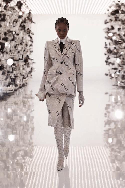 Named Aria — which is defined as a solo performance in an opera — the collection was more of a dance with soft and hard in perfect harmony. Or perhaps Michele was suggesting that he would create an aria, by blending two entities into one. Suits are marked with the names of both brands in the slanted style of Balenciaga. There’s an unmissable Gucci motif takeover of the Balenciaga Hourglass sling bag. Iced, cuban link necklaces have charms that spell out both fashion houses’ names (note the sneaky replacing of the “g” in Balenciaga with Gucci’s infamous double Gs). And there’s a new take on the Gucci logo belt with a single G in a font similar to Balenciaga’s “B” buckle.